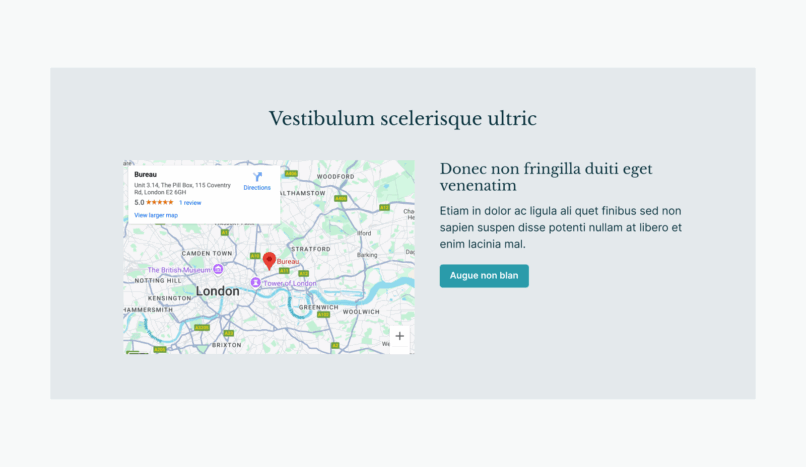 Includes options for background colour, heading and body text, map (via embed code), orientation, and button link options.